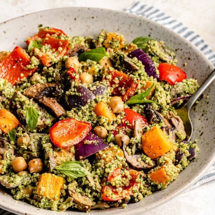 In a serving bowl, create a bed of cooked quinoa. Top with the roasted vegetables. Drizzle a little more olive oil if desired and garnish with freshly chopped herbs.